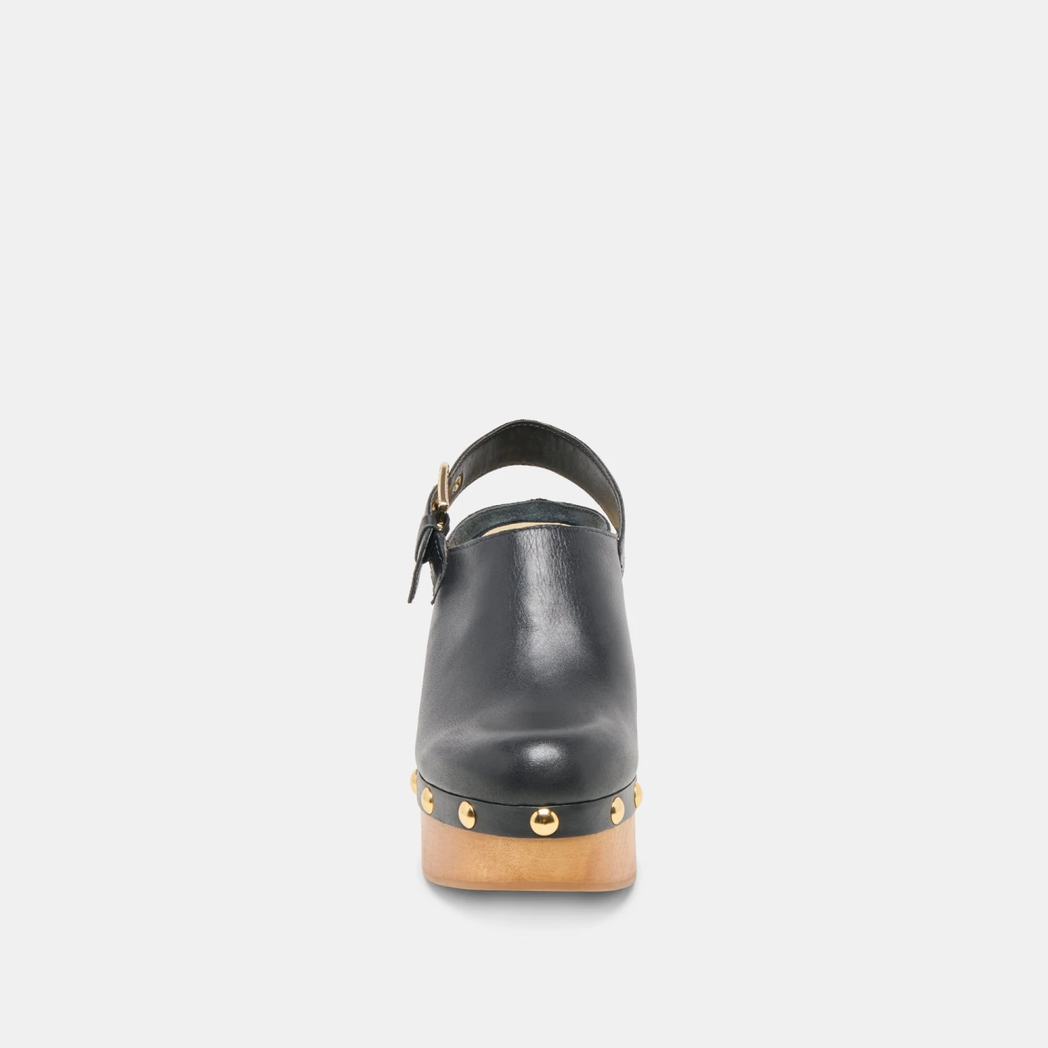 The clog revival is here and ultra-chunky ADELAN can’t be missed. Black leather is accented with a gold buckle and metal studs and finished off with a wood sole. Style her with belted pleated pants for the office or with flared denim for a day out.