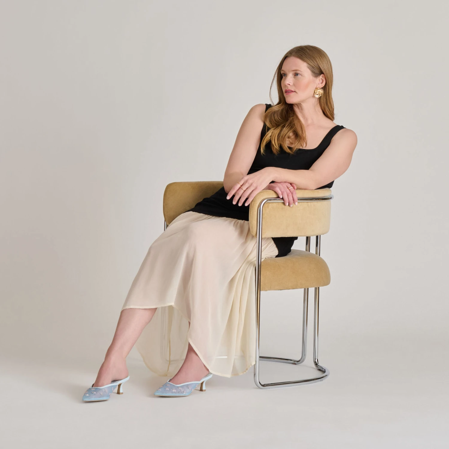 Feel light, airy, and polished when you slide on the mesh and flower detailed CLARA. Crafted from recycled materials, this delicate kitten mule will have you striding into spring with confidence and ease.
