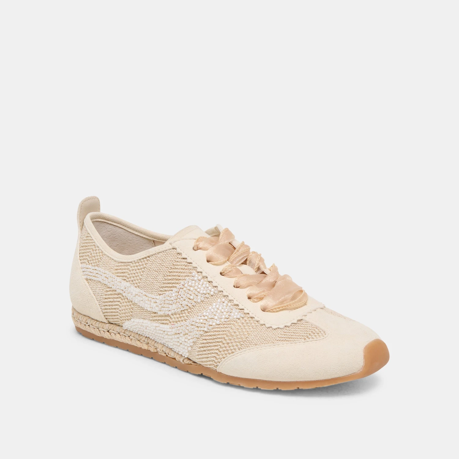 These sporty stunners are a dream to walk in. DREAM BEAD features a slim tennis silhouette that keeps you on-the go, and her burlap outer is dotted with swirling two-tone beads. sure to catch the light Grab these sporty staples natural or blue.