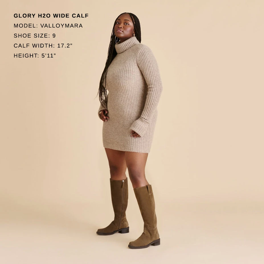 Now available in wide calf sizes, GLORY H2O perfectly combines edgy and timeless. This knee-high boot features pull tabs and a chunkier block heel dotted with stitching detail. Her sleek leather silhouette is both waterproof and insanely versatile.