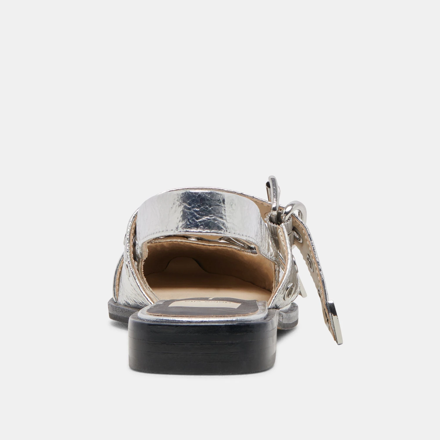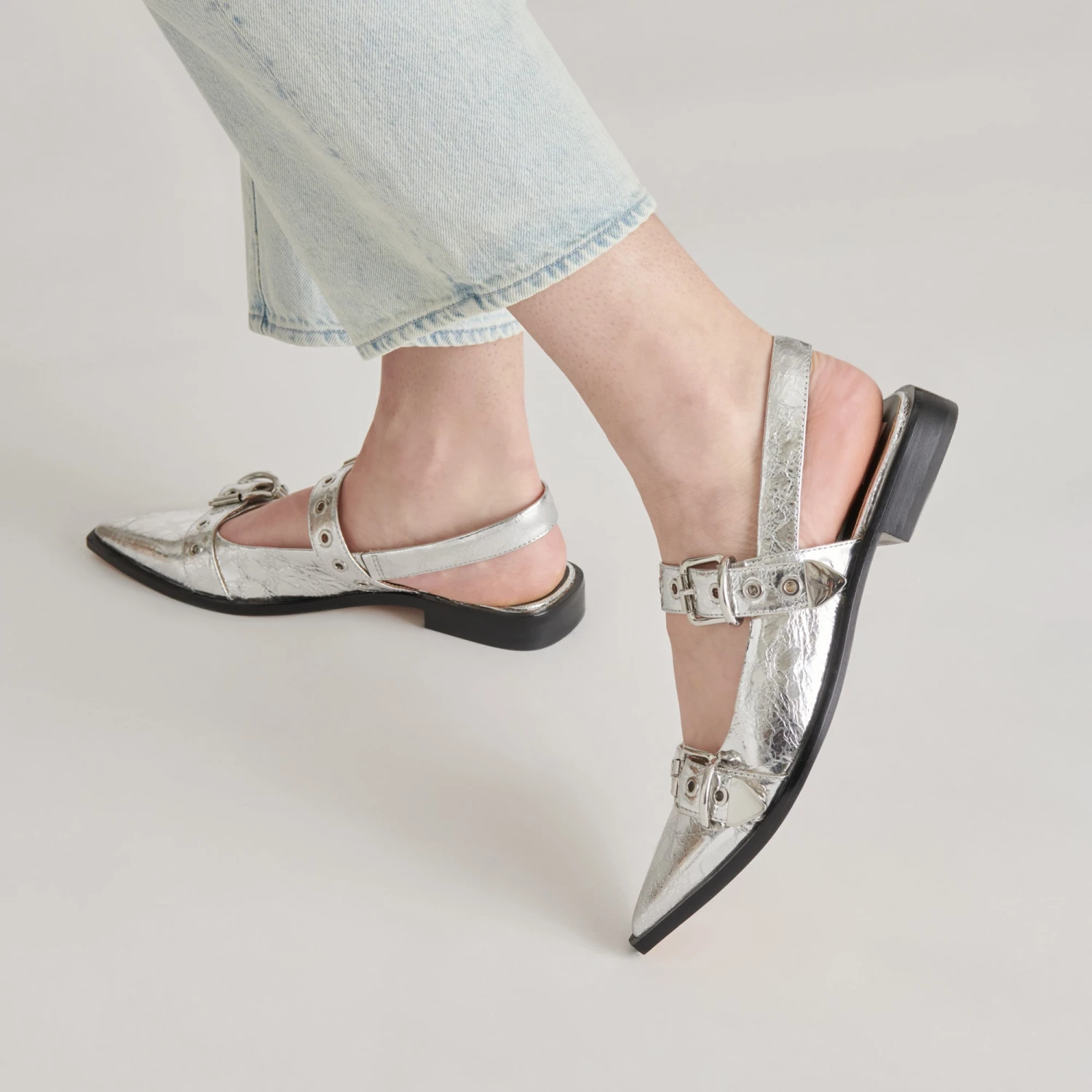 Bold and edgy, LABELL is one statement-making flat. Her slingback design is complete with metal buckles, a pointed toe, and crinkle patent colorways that can’t be missed.