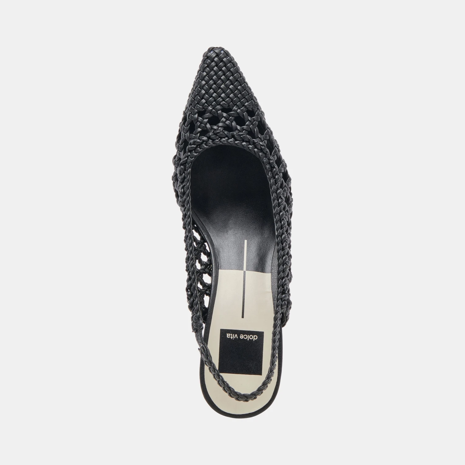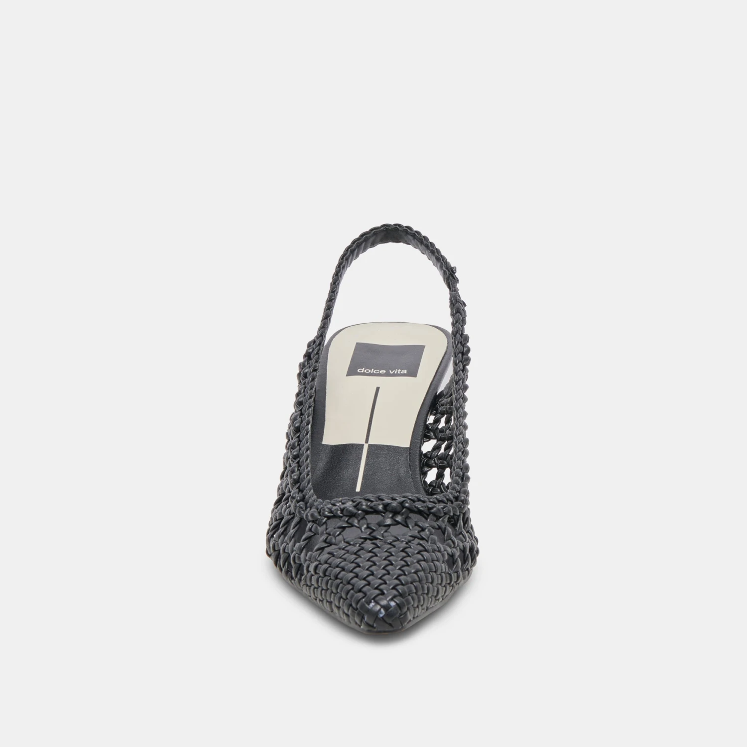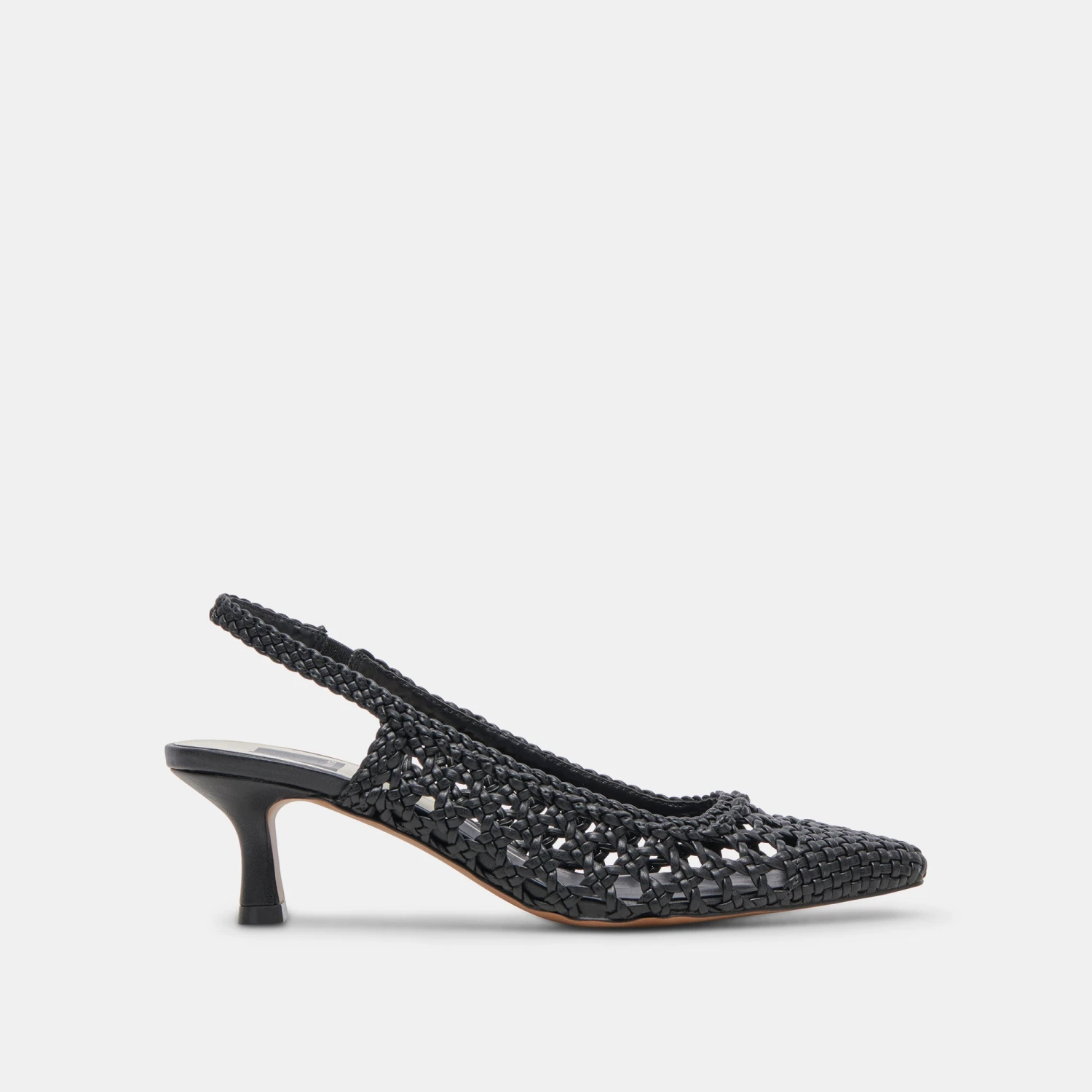 OLYMPA has that timeless vintage look. This sling-back with a kitten heel features an all over braided design in white, black, or gold metallic.
