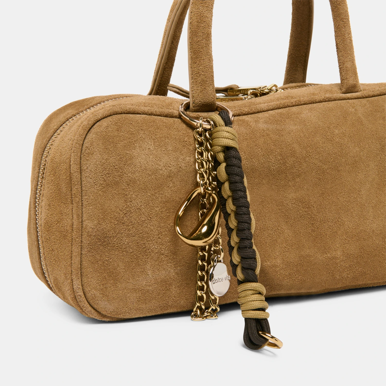 SANTINA combines a modern silhouette with a classic suede design. This pill-shaped handbag features all over taupe suede with a removable hangoff charm for an extra fun touch. Pair this timeless accessory with sweater dresses or jeans.